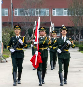 国旗仪仗队踏着铿锵的步伐,护卫着五星红旗,步履生风,目光如炬。来到国旗台下,国歌奏响的刹那,五星红旗伴随着激昂的乐符乘风而起。