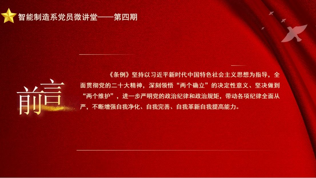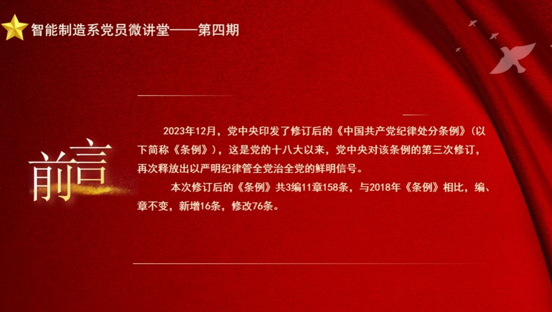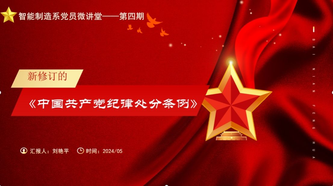 为全面落实学院第一次党代会精神,突出智能制造特色,培植“融合式”党建育人品牌,推动学院高质量发展,进一步筑牢师生理想信念根基,加强党风廉政建设,学习贯彻《中国共产党纪律处分条例》,深入开展党纪学习教育。太阳成集团tyc33455党总支开展“党员微讲堂”活动,旨在弘扬伟大建党精神和教育家精神,启智润心,倡导清正之风。